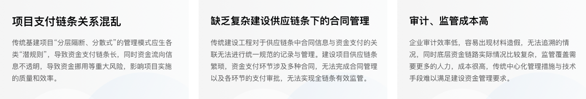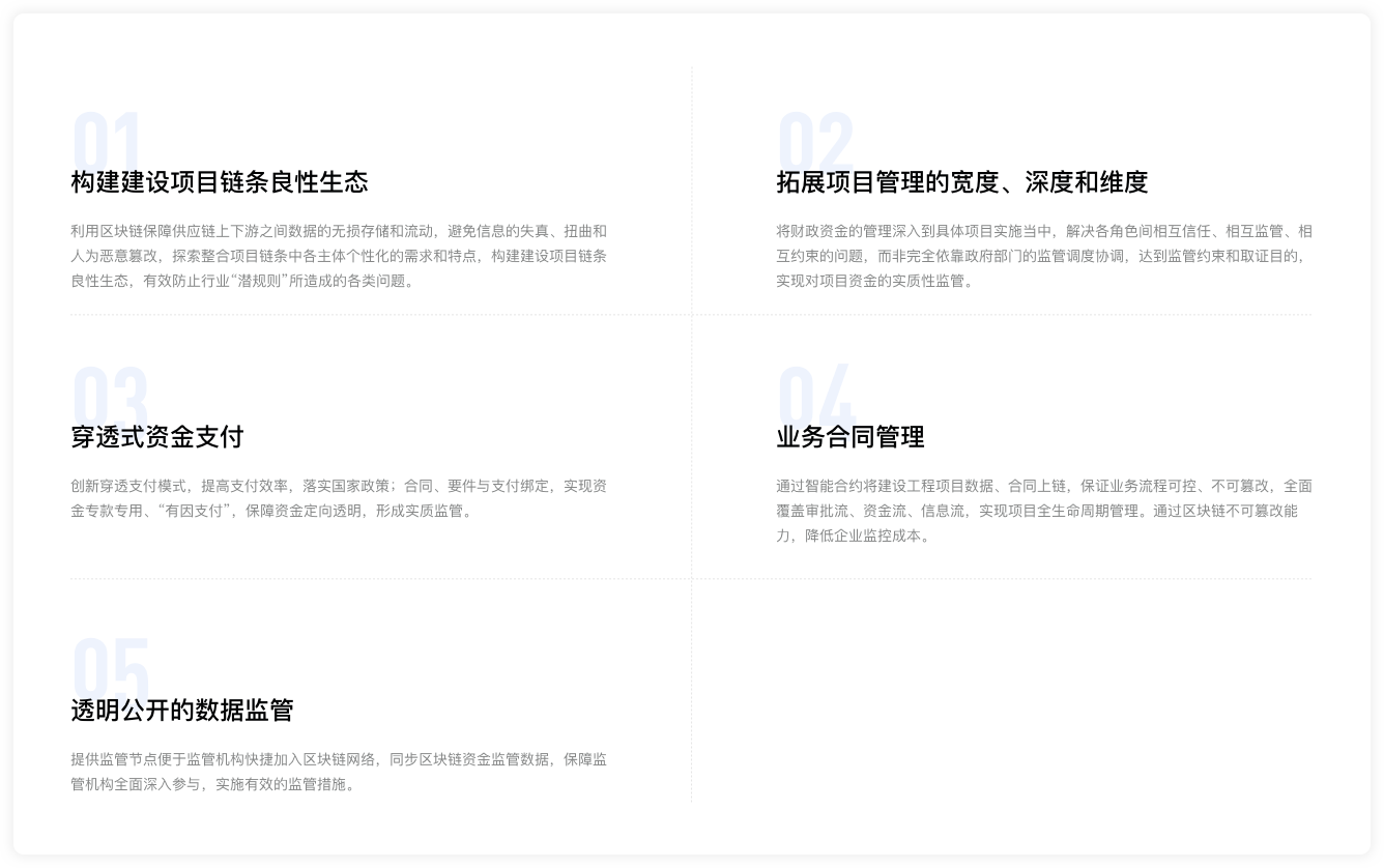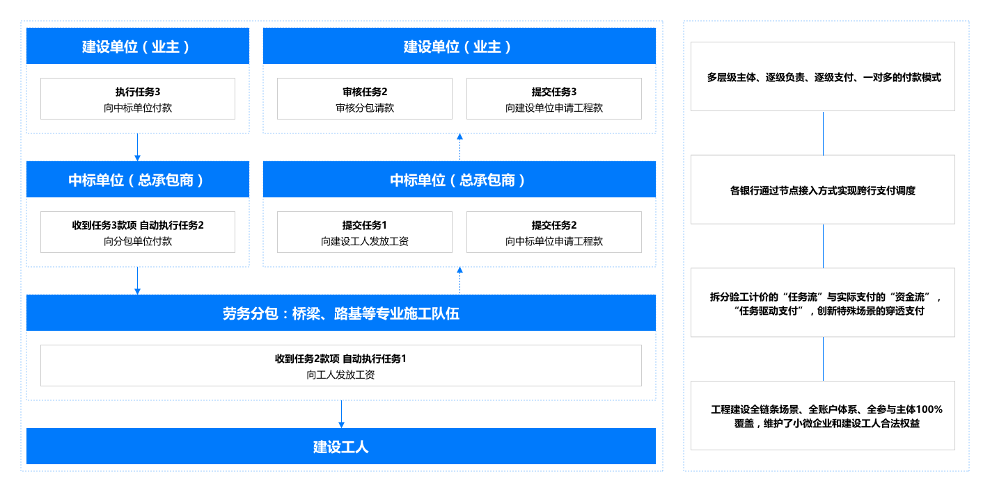 我行依托自主研發的區塊鏈底層平臺及快捷協作云平臺,以"場景+產品+技術"的增值服務產品研發模式,創新性地將區塊鏈技術應用到建設項目資金監管領域。利用區塊鏈技術可溯源、不可篡改等特性及業界首創的資金多層級"穿透支付"支付體系,將"分層隔斷、霧里看花"的項目施工鏈條"擺上臺面",有效填補了建筑施工項目資金事中管理的相對"空白",以快捷協作云平臺企業級模型與組件庫的快捷交付能力,滿足工程建設單位千家千面使用場景的定制研發需求,做到系統"易操作、可落地、能推廣"。