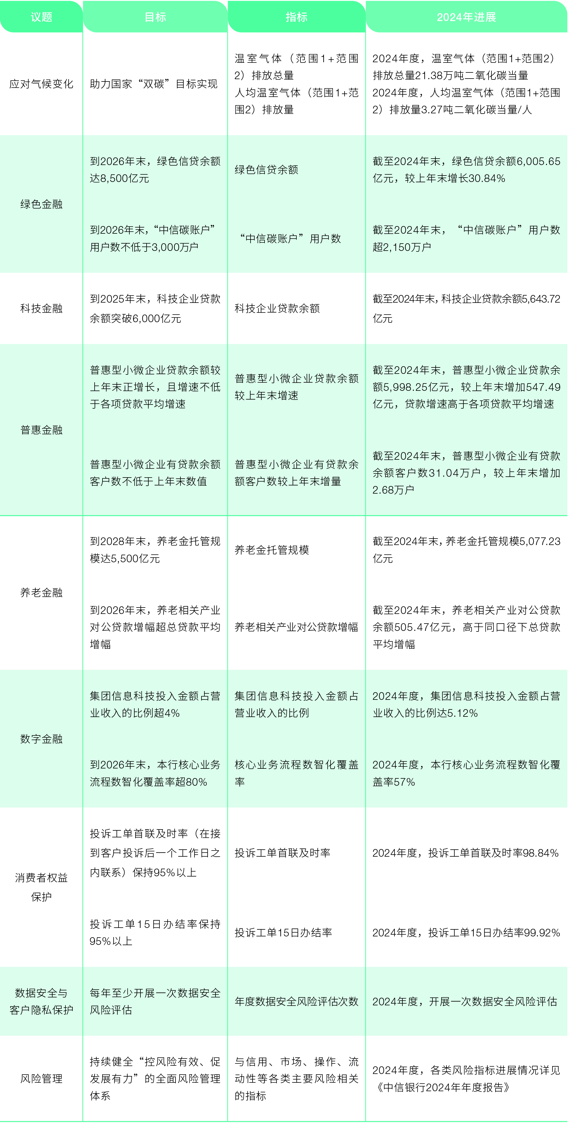 本行聚焦應(yīng)對氣候變化、做好金融“五篇大文章”、消費(fèi)者權(quán)益保護(hù)、數(shù)據(jù)安全與客戶隱私保護(hù)、風(fēng)險(xiǎn)管理等重點(diǎn)領(lǐng)域,制定可持續(xù)發(fā)展相關(guān)規(guī)劃與目標(biāo),由董事會(huì)和高級管理層定期檢視目標(biāo)達(dá)成情況,并結(jié)合自身發(fā)展情況和內(nèi)外部環(huán)境,及時(shí)調(diào)整目標(biāo)方向。