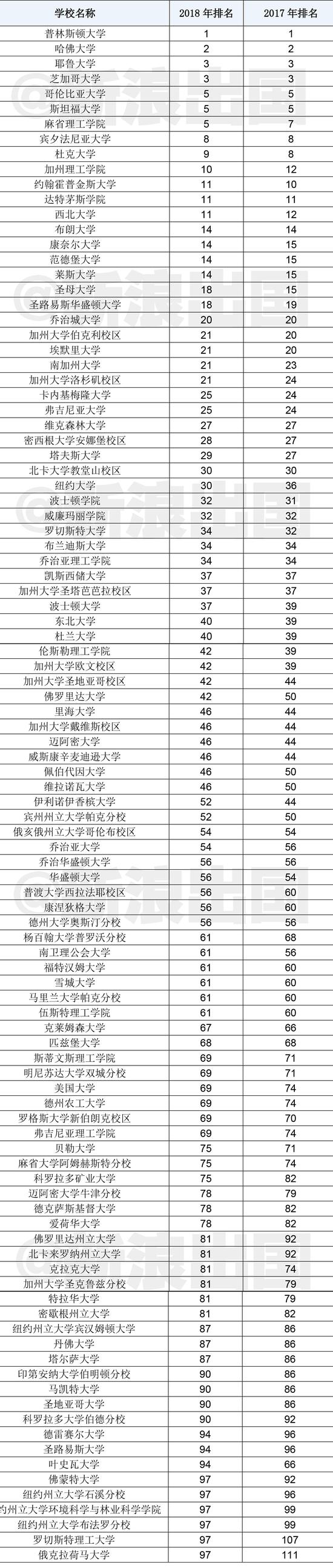 在全美綜合性大學排名中,普林斯頓大學自2016年開始連續三年蟬聯榜首。排行前十的綜合性大學依次為:普林斯頓大學、哈佛大學、耶魯大學、芝加哥大學、哥倫比亞大學、斯坦福大學、麻省理工學院、賓夕法尼亞大學、杜克大學、加州理工學院。榜單共收錄了311所美國大學,美國綜合性大學TOP100排名見下: