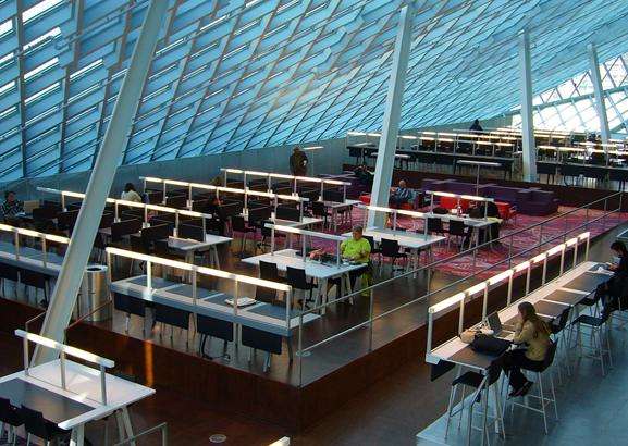 西雅圖中央圖書館是美國西雅圖公共圖書館系統的旗艦館是著名的解構主義建筑。它位于市中心,是一幢由11層(56米高)的玻璃和鋼鐵組成的建筑。該館在2004年5月24日開放給公眾使用。這個34000平方米的公共圖書館容納約145萬書籍和其他資料,其中包括超過400臺電腦向公眾開放,另設有一個地下公共停車場。頭1年的使用率超過200萬人。圖書館有一個獨特和突出的外觀,構成若干分立“浮動平臺”,就像置身在一個大的蜘蛛網。
