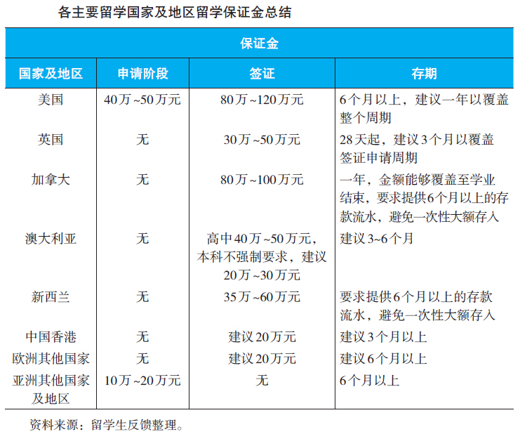各個國家和地區對存款證明的要求受當年簽證政策、學生申請階段及學校要求等因素的影響,其保證金金額及存期要求會有所變動。
