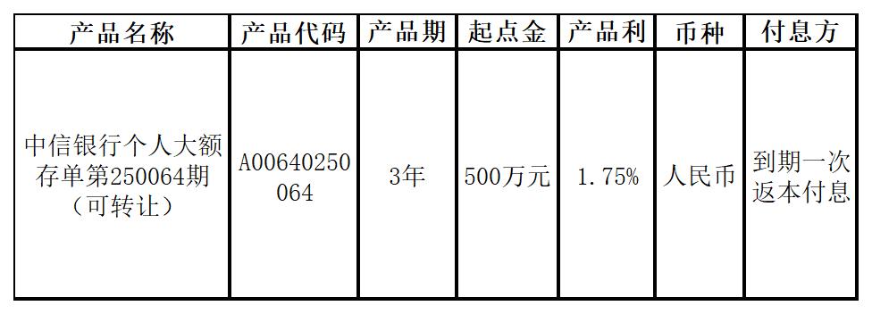 中信銀行將于2025年8月14日起發行個人大額存單第250064期產品,產品要素如下: